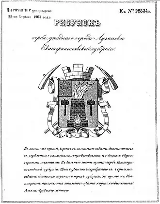 В золотом щите чёрная с золотыми швами доменная печь с червлёным пламенем, сопровождаемая справа и слева двумя чёрными молотками. В вольной части щита герб Екатеринославской губернии. Щит увенчан серебряной башенной короной с тремя зубцами. За щитом положенные стального цвета кирки, соединённые Александровской лентой.