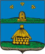 «В лазоревом поле на золотой земле хлебные снопы того же металла, сложенные в копны. В вольной части — герб Липецкой области»