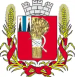 «В червлёном щите золотой хлебный сноп, перевязанный лазурной лентой, с воткнутым в него серебряным серпом».