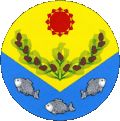 «В золотом поле с лазоревой выщербленной в один зубец оконечностью, обременённой тремя серебряными рыбами-карасями, зелёная кедровая ветвь с червлёными шишками, сопровождаемая вверху червлёным солнцем».