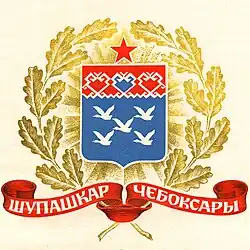 Герб города Чебоксары утверждён 4 августа 1998 года Городским собранием депутатов Чебоксар. Герб города в его нынешней форме (без обрамления гербового щита) был утверждён сессией Чебоксарского горсовета депутатов трудящихся 3 июня 1969 года. Автор герба, Элли Михайлович Юрьев, сохранил в нижней части щита пять уток с исторического герба (но они стали белыми на синем фоне). В верхней же части помещён бело-красный чувашский орнамент; в центре орнамента дата «1469».