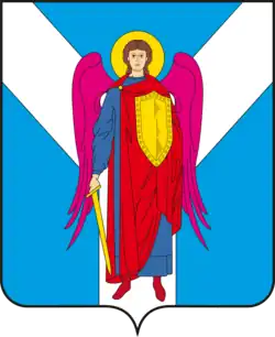 В лазоревом поле щита серебряный вилообразный крест, поверх всего — стоящий Святой Архангел Михаил естественных цветов, с пурпурными крыльями, золотым нимбом, в лазоревом одеянии, червлёном, с золотой застёжкой, плаще, в червлёной обуви, вооружённый золотыми, в левой руке — щитом, в правой — мечом.