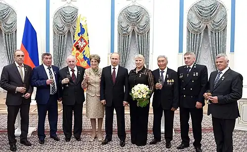 Слева направо: К. Г. Чуманов, И. У. Айдуллин, Ю. В. Лепёхин, А. И. Аксёнова, В. В. Путин, Т. Н. Покровская, М. Н. Готовцев, В. И. Мельник, Ю. А. Коннов