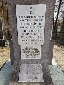 - ↑ Красавин А. Возле Ясеня в Осиповичском районе открыли памятник жертвам Холокоста Архивная копия от 31 марта 2024 на Wayback Machine