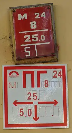 Для нахождения пожарных гидрантов на стенах зданий и сооружений, напротив которых установлен гидрант, прикрепляют указательную табличку, выполненную с использованием флуоресцентных или светоотражающих покрытий. На табличке указаны символы пожарного гидранта и цифровые значения, указывающие расстояния в метрах от указателя до гидранта. В Санкт-Петербурге указательная табличка городских пожарных гидрантов размера 12×16 см, красного цвета и имеет надпись символов и цифровых значений белого цвета. На ней, кроме того, указаны номер пожарного гидранта, внутренний диаметр водопровода в дюймах. Буква Т на табличке указывает, что гидрант расположен на тупиковой сети водопровода, буква М — гидрант московского типа, Л — гидрант ленинградского типа[5].