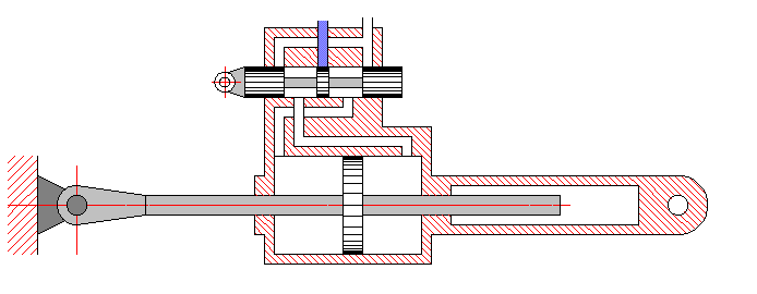 В таком гидроусилителе при перемещении ручки управления влево открывается верхний клапан, и жидкость от насоса по каналам внутри гидроусилителя подаётся в правую полость цилиндра. При этом в этой полости создаётся избыточное давление, под действием которого поршень начинает перемещаться влево, то есть в ту же сторону, в которую была перемещена ручка управления. Поскольку поршень жёстко связан с корпусом распределителя, то перемещение поршня вызывает точно такое же по величине и направлению перемещение корпуса распределителя. В свою очередь смещение корпуса закрывает верхний клапан, и подача жидкости в левую полость цилиндра прекращается, и соответственно прекращается движение поршня. Таким образом, выходное звено (шток поршня) движется синхронно с входным звеном (ручкой управления).