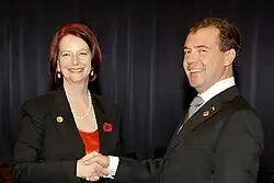 Джулия Гиллард (Джулия Эйлин Гиллард, англ. Julia Eileen Gillard; род. 29 сентября 1961, Барри) — австралийский политик, с 24 июня 2010 года по 27 июня 2013 года — лидер правящей Австралийской лейбористской партии и премьер-министр Австралии; первая женщина на этом посту и шестой по счёту премьер-министр Австралии, родившийся за границей[3].