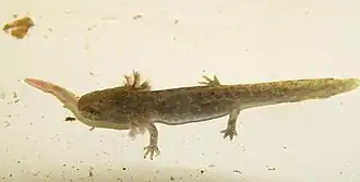 Оригинальное описание составлено по личинке. Сошниковые зубы в двух дугообразных сериях. Голова крупная, конец морды закруглён. Костальных борозд 14—15. На передних и задних ногах по четыре пальца с чёрно-бурыми ороговелостями на кончиках, образующих когти. Хвост уплощён с боков, к своему концу сужается так, что наибольшая высота приходится на его середину, на самом конце закруглён. Кожа гладкая. Окраска спины буроватая с разбросанными пятнами неправильной формы. Живот без пятен.