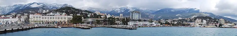 - ↑ Этот географический объект расположен на территории Крымского полуострова, бо́льшая часть которого является объектом территориальных разногласий между Россией, контролирующей спорную территорию, и Украиной, в пределах признанных большинством государств — членов ООН границ которой спорная территория находится. Согласно федеративному устройству России, на спорной территории Крыма располагаются субъекты Российской Федерации — Республика Крым и город федерального значения Севастополь. Согласно административному делению Украины, на спорной территории Крыма располагаются регионы Украины — Автономная Республика Крым и город со специальным статусом Севастополь.