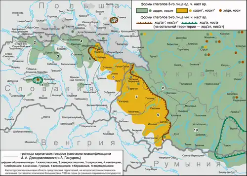 - 1 2 3 4 Ванько Ю. Русиньскый язык. Карпатьскы русиньскы діалекты. Выходны карпатьскы русиньскы діалекты : [арх. 11.09.2012] : [русин.] // Академія русиньской културы в Словеньскій републіцї. — Пряшів. (Дата обращения: 15 сентября 2020)