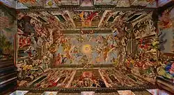 Общая композиция следует барочной схеме архитектонического символизма, в соответствии с которой потолок изображает небесный мир, а стены — земной. Потолок украшен небесными существами, призванными охранять свыше территории империи Габсбургов. Под падугами ангелы и путти парят перед архитектурой «trompe-l'œil», изображающей сцены из истории Габсбургов. Oдна из сцен на стенах посвящена победе Леопольда I, императора Священной Римской империи, над турками. Вдоль боковых стен в технике гризайль иллюзорно представлены «статуи» и «бюсты» правителей семьи Габсбургов.