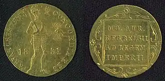 | Описание | Нидерландский дукат русской чеканки 1849 года (аверс) |