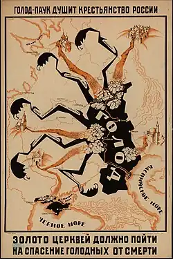 Одновременно с этим проводилось изъятие религиозного имущества. На эти средства в мае 1922 года была организована детская трудовая колония из 200 человек[15]. Имущество из дворцов и вилл Южного берега Крыма, включая ценности и произведения искусства, было реализовано Крымским Помголом на внутренних и внешних рынках за 8,9 золотых довоенных рублей и 17 тысяч турецких лир[15].