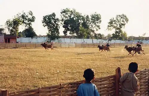 В Индонезии гонки на бычьих упряжках проводятся в различных регионах. Наиболее богатой историей, исчисляемой столетиями, отличаются состязания, проводящиеся на Мадуре, которые являются важнейшей традицией местного населения и одной из основных культурных достопримечательностей этого небольшого острова. В качестве ездовых животных используются быки местной породы. Заезды проходят ежегодно в августе-октябре в различных населённых пунктах, после чего их победители соревнуются в финальном туре, традиционно проводимом в округе Памекасан. К концу 1980-х годов популярность бычьих гонок выросла настолько, что победителю памекасанских соревнований стал вручаться переходящий приз от имени президента Индонезии, а сцена из гонок изображалась на реверсе монеты достоинством 100 индонезийских рупий, выпускавшейся в 1991—1998 годах [6][7][8][9].