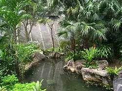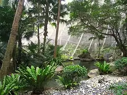 Авиарий имени Эдварда Юда, расположенный в южной части Гонконгского парка, разбит вдоль естественной речной долины на восточном склоне пика Виктория. Среди деревьев, высаженных в птичьем вольере, — инжир (Ficus carica), хлопчатник древовидный (Gossypium arboreum), бомбакс капоковый (Bombax ceiba), лумбанг (Aleurites moluccana) и несколько видов пальм. Важную для птиц лесную подстилку составляют опавшие листья деревьев, папоротников и почвопокровных растений. В климатических условиях Гонконга гигантские деревья, характерные для влажных тропических лесов, едва ли могут достичь зрелости, поэтому в авиарии они играют роль скорее имитации привычной птицам экосистемы[13].