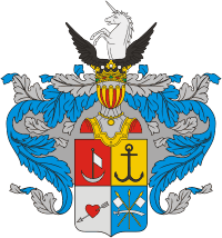Щит разделен крестообразно на четыре части. В первой части, в красном поле, на серебряной луне, рогами обращенной вверх, изображен белый флаг. Во второй части, в золотом поле, чёрный якорь (польский герб Котвица). В третьей части, на серебряном поле, изображено красное сердце, пронзенное стрелой (польский герб Пржияцель). В четвёртой части в голубом поле крестообразно означены два знамени и копье, имеющие золотые древки, а посредине — меч, положенный горизонтально. Щит увенчан дворянским шлемом и короной, на поверхности которой видны два орлиных крыла, а между ними — выходящий единорог. Намёт на щите голубой, подложенный серебром.