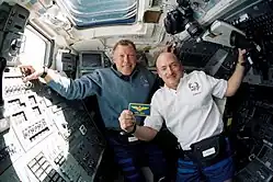 - Первый полёт — STS-91[3], шаттл «Дискавери». Со 2 по 12 июня 1998 года в качестве «пилота корабля». STS-91 стал последним полётом шаттла к орбитальному комплексу «Мир» по программе «Мир — Шаттл»[4]. Помимо проведения девятой и последней стыковки шаттла с российским орбитальным комплексом, программа полёта STS-91 предусматривала доставку и возвращение грузов, выполнение различных экспериментов[5].Грузовой отсек «Дискавери» был скомпанован не так, как обычно. В его передней части была установлена внешняя шлюзовая камера, на верху которой размещалась стыковочная система шаттла ODS со стыковочным агрегатом типа АПАС. За шлюзовой камерой был установлен туннельный адаптер с люком для выхода в открытый космос. От него в направлении к одинарному модулю Spacehab SM шёл переходный туннель. В нескольких предыдущих полётах использовался двойной модуль Спейсхэб, но на этот раз он бы не уместился, потому что за модулем в грузовом отсеке была установлена поперечная ферма, на которой был размещён спектрометр AMS. Продолжительность полёта составила 9 суток 19 часов 55 минут[6].