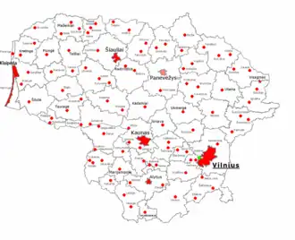 В Литве выделяются четыре типа населённых пунктов: города, местечки, деревни и хутора[1]. Статус города предоставляет Сейм Литовской Республики; населённым пунктам может быть присвоен статус курорта. По данным Департамента статистики Литвы насчитывается 103 города (данные на 2009 год).