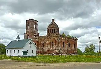 Кирпичная четырёхстолпная однокупольная церковь Михаила Архангела в русском стиле с шатровой колокольней и шатровым куполом сооружена в 1892—1894 годах попечением купца Т. И. Трошина по проекту архитектора Николая Маркова. У церкви было два придела, один из которых Казанский. После росписи стен церковь вторично освящена в 1913 году (сохранились фрагменты фресок)[26].
