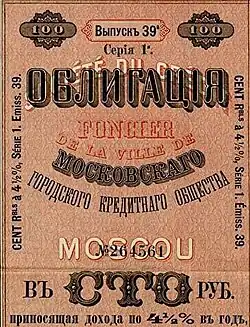В целях обеспечения обращения на зарубежных фондовых биржах бланки русских ценных бумаг имели текст на французском языке. Чтобы обозначить отношение нового кредитного учреждения к ипотеке, создатели петербургского городского кредитного общества выбрали слово фр. foncier — один из синонимов слова недвижимость (фр. immobilier), означающий «земельный, поместный»[3], и встречающийся в названиях банков во Франции (crédit foncier). Однако в русском названии общества эквивалент слова foncier опустили. Это привело к расхождению между русскими и переводными названиями: на французском на облигациях Петербургского, Московского, Рижского и др. городских кредитных обществ значилось société du crédit foncier, а на русском просто «кредитное общество» без уточнения.