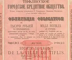 Девять лет спустя, в 1880 году Тифлисское городское кредитное общество (его устав утверждался уже не «высочайше», а товарищем (заместителем) министра финансов) вообще отказалось указывать на своих облигациях отношение своего общества к недвижимости. При этом сам термин кредитное общество был переведён на два языка: не только фр. société du crédit, но и нем. Städtische credit-geselleschaft