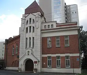 Главный фасад здания состоит из трёх частей. По центру его акцентирует башня, в которой находится главный вход с арочным порталом. Этот портал фланкируют спаренные полуколонны, на них установлен треугольный фронтон с небольшим оконным проёмом. Ритм узких и перспективно уменьшающихся в высоту оконных проёмов подчёркивает вертикаль башни[1].