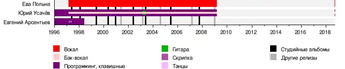 - Ева Польна — вокал, тексты, музыка (1997—2009, 2018)