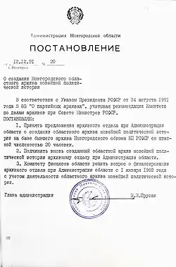 Согласно Указу Президента РСФСР от 24 августа 1991 года № 83 «О партийных архивах» архивы КПСС были переданы в ведение государственных архивных органов РСФСР[6]. 28 августа 1991 года была создана межведомственная комиссия для приёма-передачи дел бывшего партархива обкома КП РСФСР вместе с занимаемым зданием, штатной численностью и фондом оплаты труда[7]. Бывший партархив был сначала преобразован в архивохранилище № 3 Государственного архива Новгородской области, а 12 декабря 1991 года согласно постановлению Администрации Новгородской области на базе бывшего партийного архива был образован Новгородский областной архив новейшей политической истории (НОАНПИ)[8].