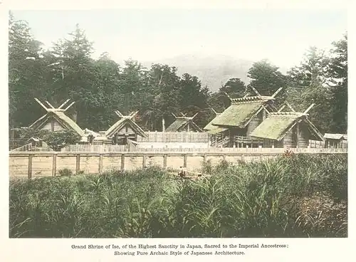 Велась пропаганда о том, что Исэ Дзингу[b] это фамильное святилище императорского рода, поскольку оно является обителью его божественной прародительницы Аматэрасу. Муцухито впервые посещает данное капище в 1869 году. В конечном счете оно стало преобразовываться в головное святилище синтоизма. 17 сентября, в день главного праздника святилища Исэ, крестьяне в принудительном порядке приходили поклоняться Исэ Дзингу «издали» в своих местных капищах. Некоторые из таковых превращались в полноценные филиалы нового головного святилища[12]. Власти обязали всех японских поданных приобрести табличку с именем Аматэрасу, которую следовало купить в святилище Исэ. Её ставили на алтарь камидана, который был у большинства семей Японии. Поскольку синто с 1880-х годов стал считаться государственным обрядом, а не религией, то такую табличку, а следовательно, и синтоистский алтарь должны были иметь дома все подданные, вне зависимости от вероисповедания[13].