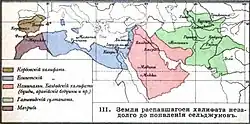 Карта распавшегося арабского халифата незадолго до вторжения Сельджуков. Автор — А. Е. Крымский