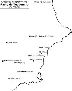 - ↑ Договор между Абд аль-Азизом и Теодомиром (713 г.). История Реконкисты. Дата обращения: 18 июля 2012. Архивировано 29 сентября 2012 года.