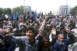 Спустя несколько часов после этого группы молодых людей, объединяемые термином «молодёжь Душанбе», захватили телецентр и передали его под контроль оппозиции. Вооружённые столкновения за овладение ключевыми правительственными зданиями в Душанбе продолжались весь следующий день. Сторонники оппозиции блокировали транспортные магистрали, а также установили контроль над аэропортом и вокзалом. На их сторону перешли местная милиция, ОМОН и советник президента по военным вопросам генерал-майор Бахром Рахмонов[22]. 7 мая президент подписал с силами оппозиции соглашение, по которому им был предоставлен контроль над 8 министерствами и предусматривался роспуск гвардии, а полномочия президента существенно ограничивались. Однако ситуация в стране после этого не стабилизировалась. 10 мая сторонники оппозиции двинулись к зданию Комитета национальной безопасности, где предположительно находился президент, требуя, чтобы он выступил перед ними. В тот момент, когда люди подошли к зданию КНБ и начали разбирать заграждения из колючей проволоки, силами безопасности по ним был открыт огонь, в результате чего погибли 14 человек[19]. После этого на площади Шахидон начался новый митинг. На следующий день после этих событий было сформировано Правительство национального примирения, в котором оппозиция получила восемь должностей, в том числе, несколько ключевых. 16 мая последняя колонна автобусов увезла участников митинга с площади Шахидон в родные кишлаки[17].