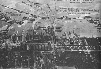 - ↑ Рапорт командира линейного корабля «Андрей Первозванный» П. Ю. Постельникова начальнику ДОТ С. Н. Дмитриеву от 18 августа 1919 года. Публикация: Кузнецов Л. А. Нападение, совершенно неожиданное по своей идее. // Гангут. — 2001. — Вып. 26. — С. 108.