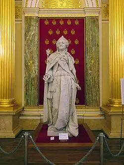 Статуя Екатерины II работы А. Опекушина. 1896. ГМЗ Царицыно. Решение о создании скульптуры Екатерины II было принято на заседании Московской городской думы 15 марта 1885 г. – в год 100-летия со дня издания императрицей Жалованной грамоты городам Российской империи (21 апреля 1785 г.). Первоначально предполагалось установить её на Воскресенской (ныне площадь Революции) площади перед новым, тогда ещё не построенным, зданием Думы. В 1896 г. скульптура была выполнена академиком А. М. Опекушиным и в день 100-летия со дня кончины императрицы 6 ноября 1896 г. установлена в Большом зале Московской городской думы.
