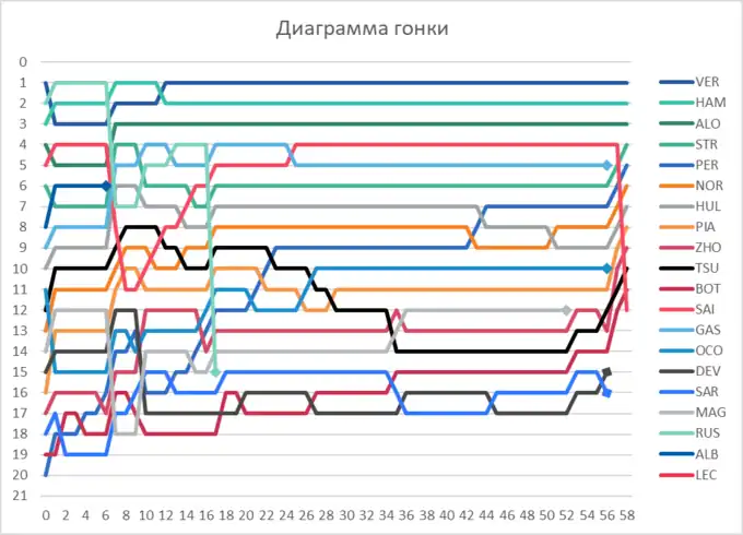 | 5 | ПЛ | ▲14 | 11 | Red Bull-RBPT | P | 58 | +3,320 | 120,288 | 5 | HMHHSS | 10+1 | |