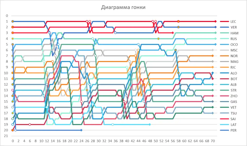 | 6 | 9 | ▲3 | 47 | Haas-Ferrari | P | 70 | +1 круг | 214,549 | 2 | MHH | 8 | |