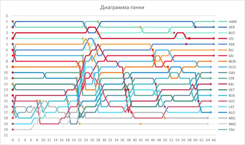 | 10 | 12 | ▲2 | 10 | AlphaTauri-Honda | P | 65 | +1 круг | 194,349 | 2 | SMS | 1 | |