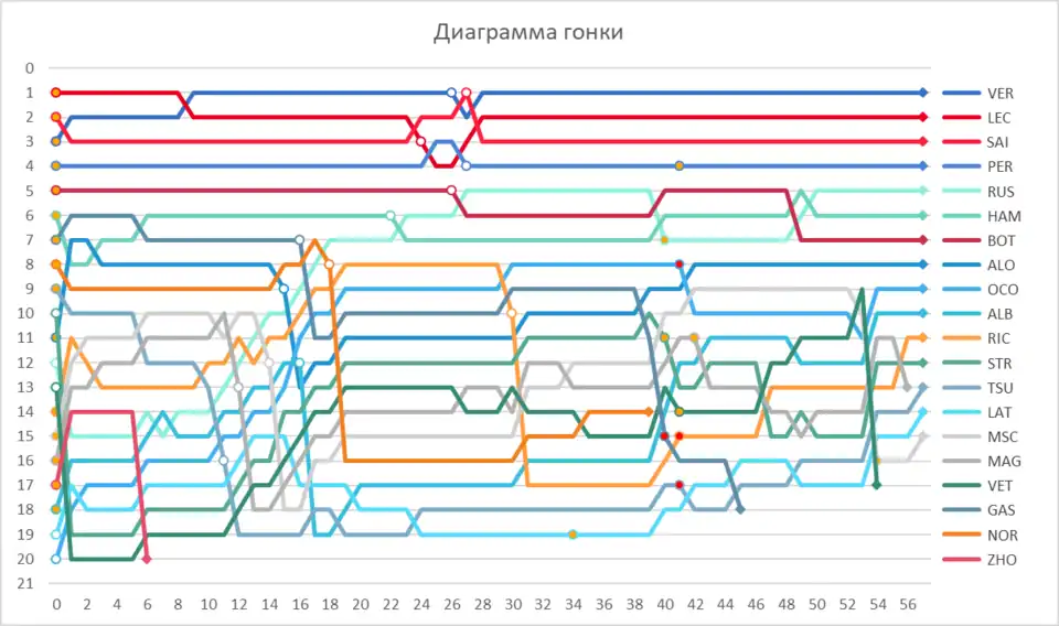 В гонке победил Макс Ферстаппен на Red Bull, вторым финишировал Шарль Леклер на Ferrari, третьим — Карлос Сайнс (мл.) на Ferrari.