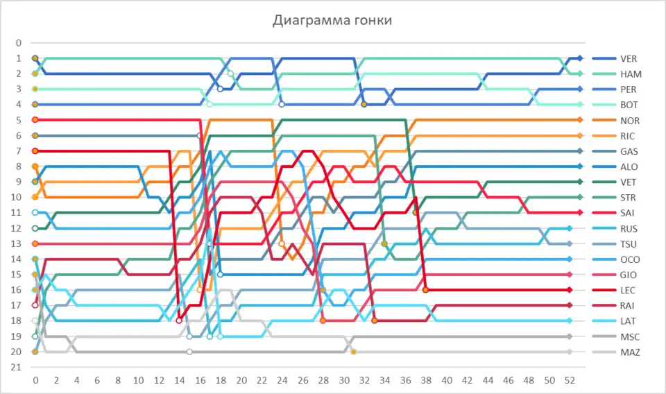 | 19 | 15 | ▼4 | 47 | Haas-Ferrari | P | 52 | +1 круг | 206,390 | 1 | MH | ||
