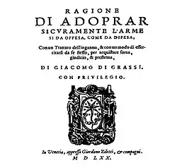 - ↑ Ragione di adoprar sicuramente l’arme si da offesa, come da difesa. Giacomo di Grassi, 1570