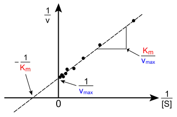 Графическое представление уравнения Лайнвивера — Берка — прямая, которая соответствует виду: y = ax + b. Преобразуем уравнение Михаэлиса — Ментен в линейную форму, для более удобного расчёта величин Vmax и Km. В частности если:
