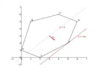 Если многоугольник решений ограничен (см. рисунок), то прямая дважды становится опорной по отношению к многоугольнику решений (в точках и ), причём минимальное значение принимает в точке . Координаты точки находим, решая систему уравнений прямых и .