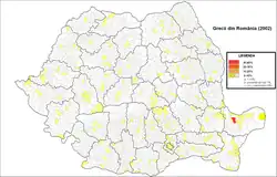 Согласно переписи населения, проведенной в Румынии в 2002 году, греческая община насчитывала 6,472 человек. По словам Генерального секретариата по делам греков зарубежья, греческая община в Румынии составляет 14000 человек[5]. Большинство греков проживает в Бухаресте и его окрестностях. Также большое количество греков проживает в Добрудже в жудецах Тулча и Констанца[6], а также по реке Дунай в жудецах Брэила и Галац. Эллинский Союз Румынии — политическая партия, основанная в 1990 году, представляет собой политическое и культурное сообщество, представляет греческую общину в палате депутатов Румынии.