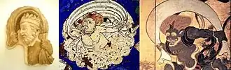Харити (справа), держащая рог изобилия- Крылатый атлант с характерной бородой