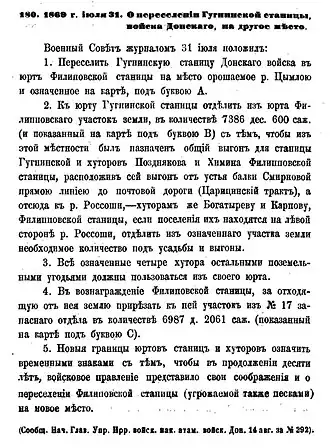 Четвертое: 31 июля 1869 года военный совет РИ постановил переселить станицу Гугнинскую на новое более удобное место, на правый берег реки Цимлы, там, где в нее впадает река Россошь, на юртовую землю Филипповской станицы[3].