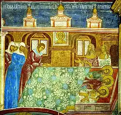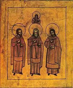 - ↑ Перевод: чудо сотворите приходящим к вам с верой, потерпевшим помогите, виновных обличите, уста злодеев заградите.