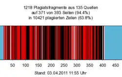 В интернете был создан ресурс «GuttenPlag Wiki», где добровольные участники выкладывают результаты сравнительного анализа текста диссертации министра и оригинальных источников. Там же дважды в день выкладывается график мониторинга. Согласно данным на 1 марта, из 394 страниц диссертации (без учёта оглавления и приложений) 300 страниц, или 76,34 %, являются плагиатом[12].