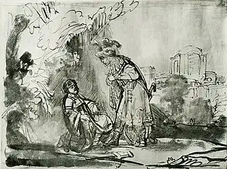 В своих рисунках Рембрандт неоднократно обращался к библейской истории о Давиде и Ионафане. Первый из таких рисунков датируется 1632—1633 годами и хранится в Институте изящных искусств Барбера в Бирмингеме; второй, выполненный в 1640—1642 годах, находится в Гравюрном кабинете в Берлине; ещё один вариант 1643—1644 годов — в парижском Лувре; другой 1650 года — в Музее Школы дизайна Род-Айленда. Есть и иные графические произведения на эту тему[3]. Варианты с изображением коленопреклонённого Давида многие исследователи относят к более раннему сюжету — клятве Давида и Ионафана. К эрмитажной картине наиболее близок рисунок 1643—1647 годов из Рейксмюсеума в Амстердаме[4]. Последний современные исследователи относят к работе ученика Рембрандта Фердинанда Бола[5].