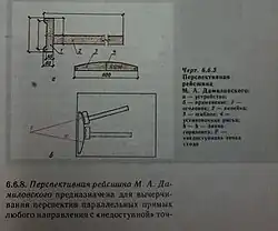 Нашёл оригинальный способ построения архитектурных перспектив с помощью приспособления, которое получило название «линейки Дамиловского» или «перспективной рейсшины Дамиловского».