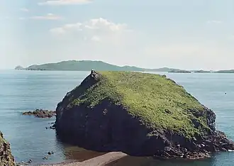 Восточный берег острова с кекуром и центральной наиболее высокой скалой.